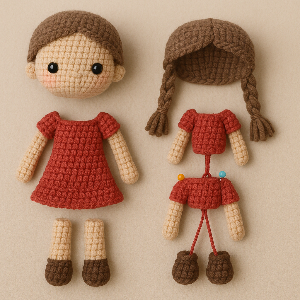 | Linha | Fio de algodão mercerizado (ex: Círculo Amigurumi) nas cores: pele, cabelo, vestido, branco para os olhos, e cores extras para sapato e detalhes. |